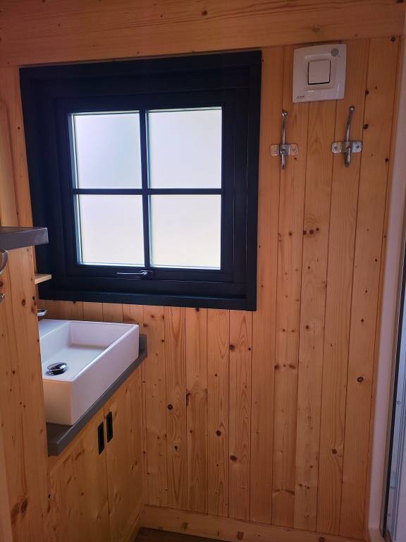3 lits simples en 80 et salle de bain (accessible par des marches, toilettes, lavabo, douche), penderie.